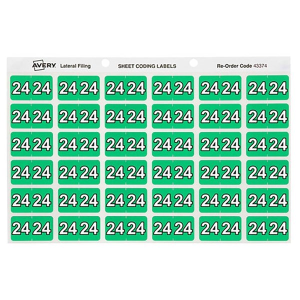 - There are 180 green numeric 24 side tab year colour coding labels in a pack with a size of 25 x 38mm ready to stick straight onto the side tab of your Avery lateral files