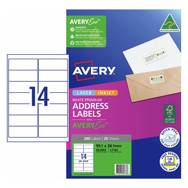 AVERY 952003 L7163 QUICK PEEL ADDRESS LABEL WITH SURE FEED LASER 14UP WHITE PACK 20