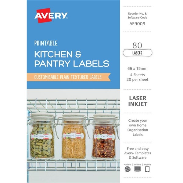 Create your own stylish and personalised organisation solutions with Avery textured white printable Kitchen and Pantry Labels - They are perfect for use on canisters, food storage containers, or any other storage item in the home