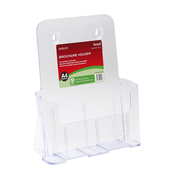 The Deflecto Recycled A4 Portrait Wall Mount Sign Holder is perfect for displaying signs, messages and other information at your business - Installation is easy thanks to the pre-drilled holes and top and side loading