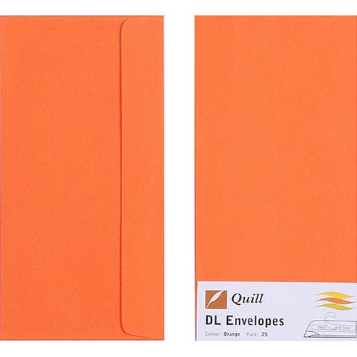 QUILL DL COLOURED ENVELOPES PLAINFACE STRIP SEAL 80GSM 110 X 220MM ORANGE PACK 25