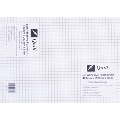 QUILL Self Adhesive Foam board has a peel-off covering sheet to reveal a smooth self adhesive surface with a rigid 5mm foam core - Quick and easy to use, no need for messy spray glue with high-tack quick bonding surface