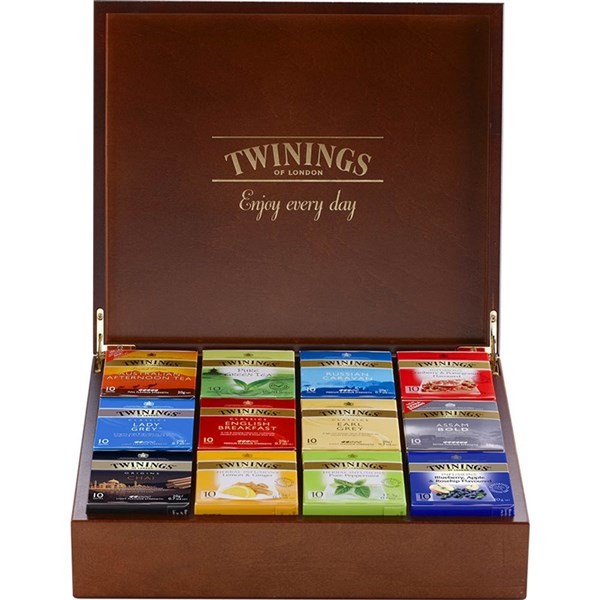 A beautiful Twining's Tea Chest containing a combination of black tea, green tea and infusions in a uniquely crafted wooden box - These Uniquely crafted wooden tea chests are ideal for kitchen, boardrooms or make the perfect gift