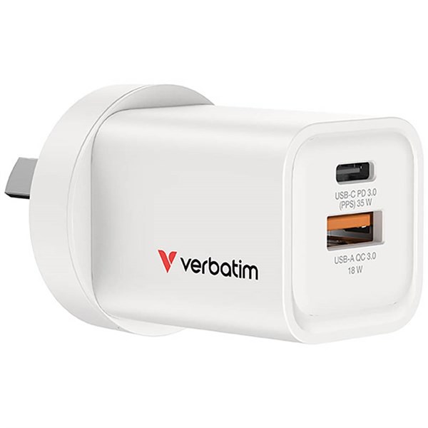 VERBATIM USB GAN CHARGER 2 PORT 35W USB A/C WHITE