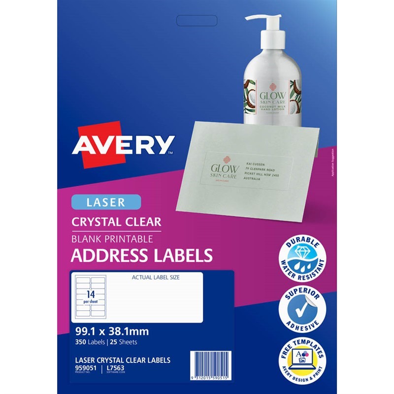 Avery Crystal Clear Address Labels are 100% transparent, providing a glossy finish to your mail - They are incredibly durable (oil, dirt, splash and tear proof), adhering to almost any polished surface