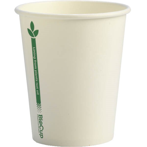 Paper BioCups are made from premium paperboard with a bioplastic lining made from plants, not oil - This 8oz White Green Line cup fits our small lids