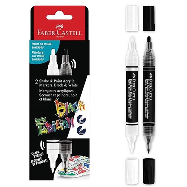 Create bold and expressive marks on multiple surfaces with Faber-Castell black edition shake and paint acrylic markers - With highly pigmented opaque water-based acrylic ink across two versatile nibs, these markers unlock individuality and can transform surfaces from drink bottles to backpacks with bold designs that stand out from the crowd