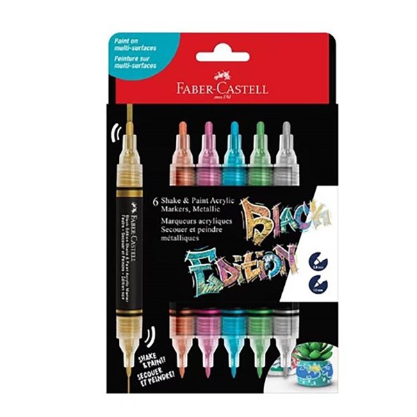 Create bold and expressive marks on multiple surfaces with Faber-Castell black edition shake and paint acrylic markers - With highly pigmented opaque water-based acrylic ink across two versatile nibs, these markers unlock individuality and can transform surfaces from drink bottles to backpacks with bold designs that stand out from the crowd