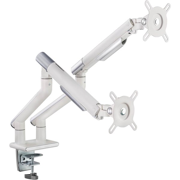 The EMA49-C24 is a high-quality white gas spring dual monitor arm which offers smooth and stable tilting, swivel, and rotation - Once mounted to the arms, the monitors are adjustable with fingertip control, making it quite simple to for the user to adjust it to give the perfect view and posture