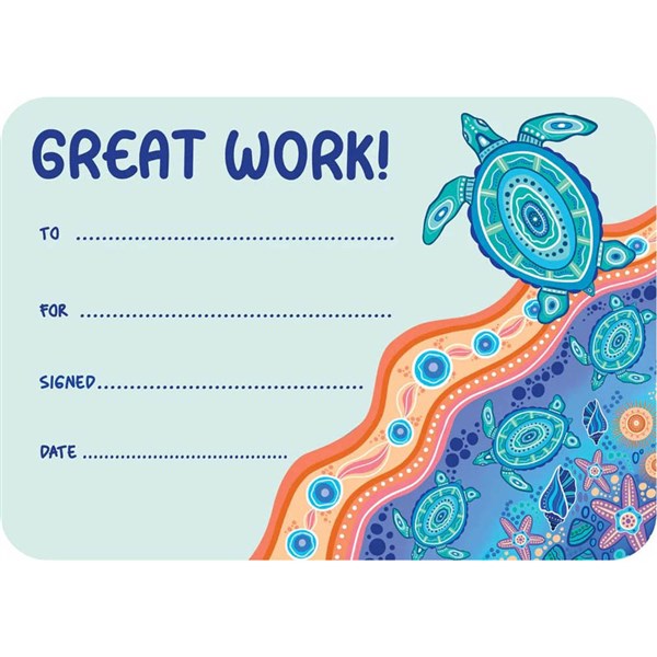 Recognise effort and achievement with the Ocean Country Great Work Certificates, featuring vibrant First Nations artwork by Holly Sanders - Thoughtfully designed to celebrate growth, dedication and positive contributions, these certificates provide a meaningful way to acknowledge learning, sporting participation and personal progressPack of 30 certificates, each certificate measures A5 size (210mm x 148mm)Discover the complete Ocean Country collection by artist Holly Sanders, featuring a stunning range of classroom resources inspired by her uniqueartistic style and cultural storytelling.