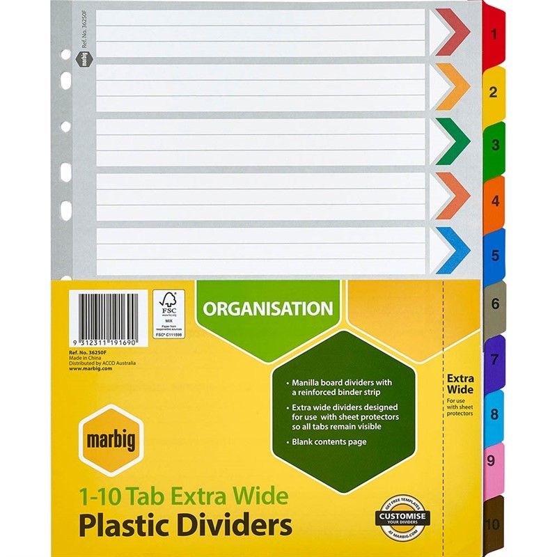 Marbig extra wide dividers are made from reinforced manilla board with plastic reinforced tabs and binder strips for durability and longer life - Designed for use with sheet protectors as the tabs extend beyond the edge of the pocket