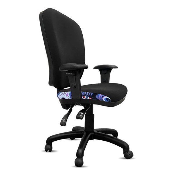 - A unique commercial fabrics designed by Nelly Patterson (Indigenous Artist) combined with K2 black fabric to upholster the chair
