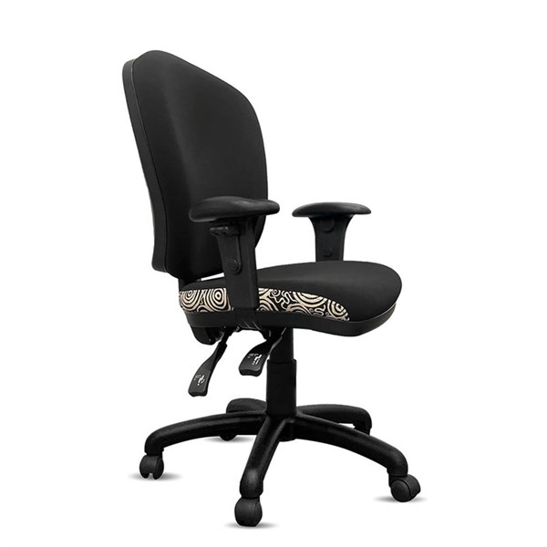 - A unique commercial fabrics designed by Nelly Patterson (Indigenous Artist) combined with K2 black fabric to upholster the chair