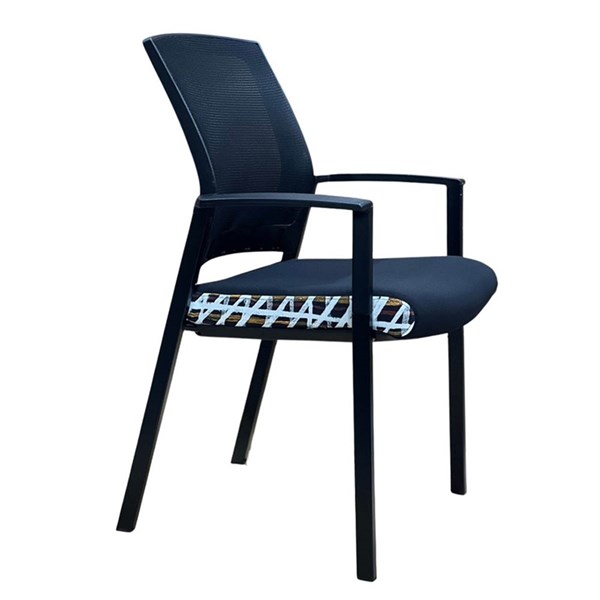 This chair is designed for aged care, education, visitor seating, break-out zones or any office areas with indigenous fabric and black commerical fabric upholstered for the seat - They are also perfect for waiting halls or receptions with their comfortable mesh back and super strong durable construction