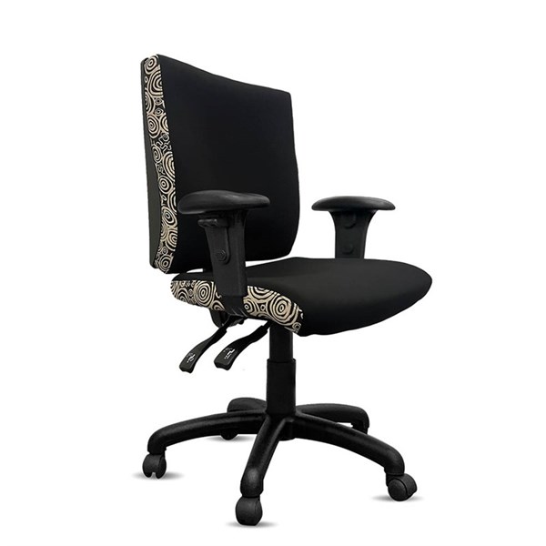 - A unique commercial fabrics designed by Nelly Patterson (Indigenous Artist) combined with K2 black fabric to upholster the chair