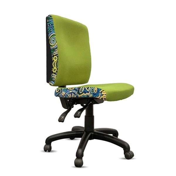 - A unique commercial fabrics designed by STEPHEN JUPURRURLA NELSON (Indigenous Artist) combined with K2 black fabric to upholster the chair