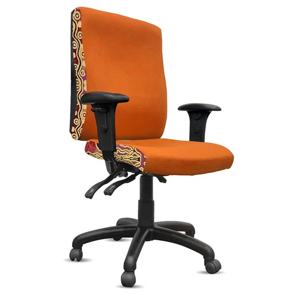 - A unique commercial fabrics designed by STEPHEN JUPURRURLA NELSON (Indigenous Artist) combined with K2 Fabric to upholster the chair
