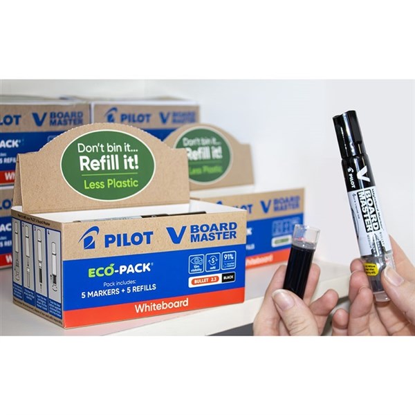 PILOT BEGREEN V BOARD MASTER WHITEBOARD MARKER BULLET TIP BLACK ECO PACK 5 WITH 5 REFILLS