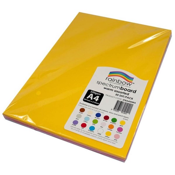 RAINBOW SPECTRUM BOARD 220GSM A4 ASSORTED WARM PACK 50