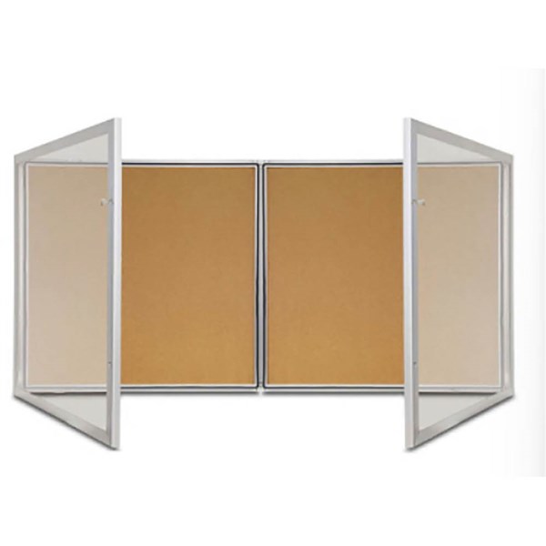 - This 1350 x 980mm cork pinboard includes dual lockable clear polycarbonate doors, a water-resistant seal, and a strong satin silver aluminium frame ideal for schools, councils, and site entry points requiring reliable outdoor communication